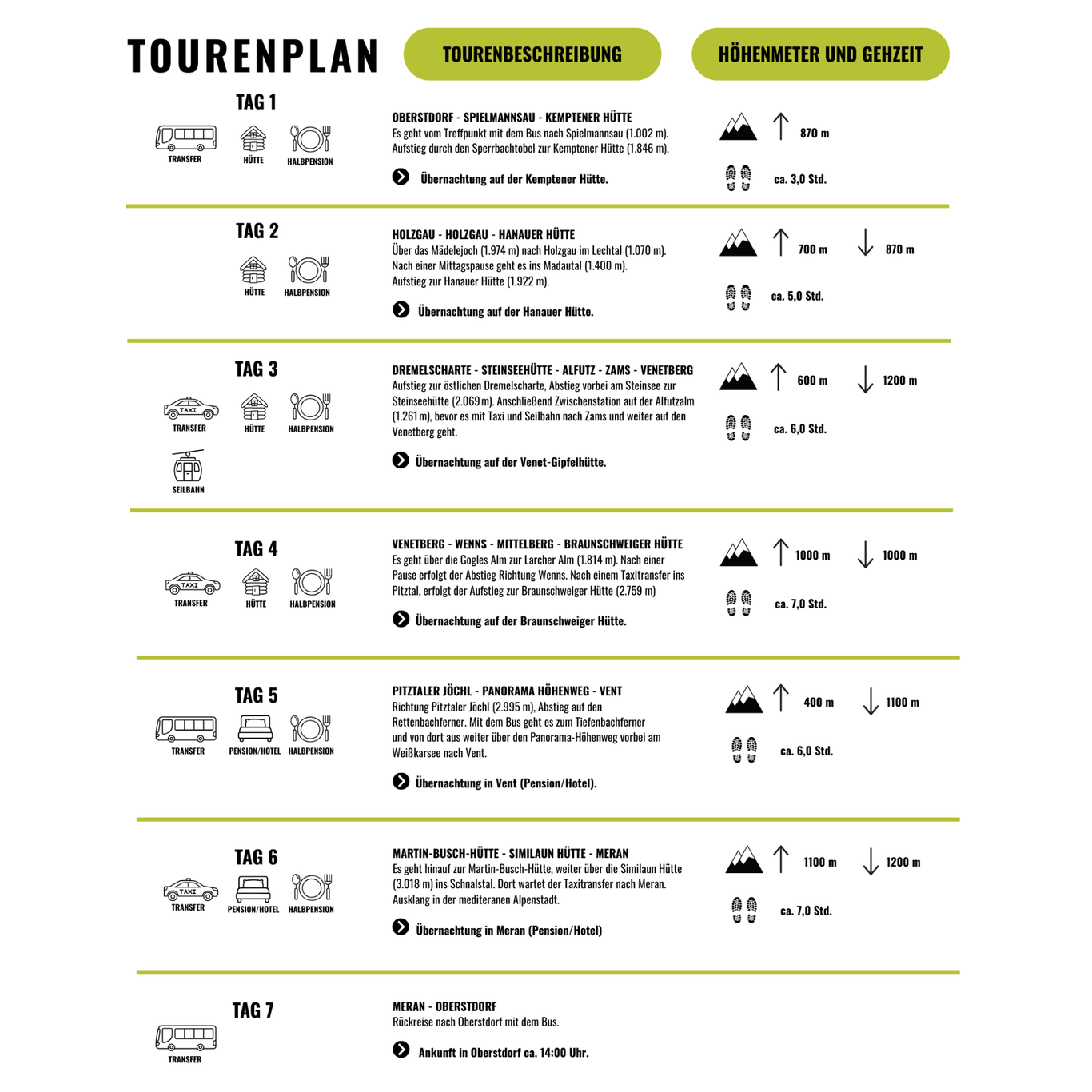Der E5 erstreckt sich von Brest an der französischen Atlantikküste bis in den norditalienischen Ort Verona. Mit 3200 Kilometer ist er einer der längsten Fernwanderwege Europas. Die Alpenüberquerung von Oberstdorf nach Meran ist ein Abschnitt des E5 und führt von Oberstdorf im Allgäu über das Lechtal, das Inntal, das Pitztal, das Ötztal und das Schnalstal nach Meran in Südtirol.